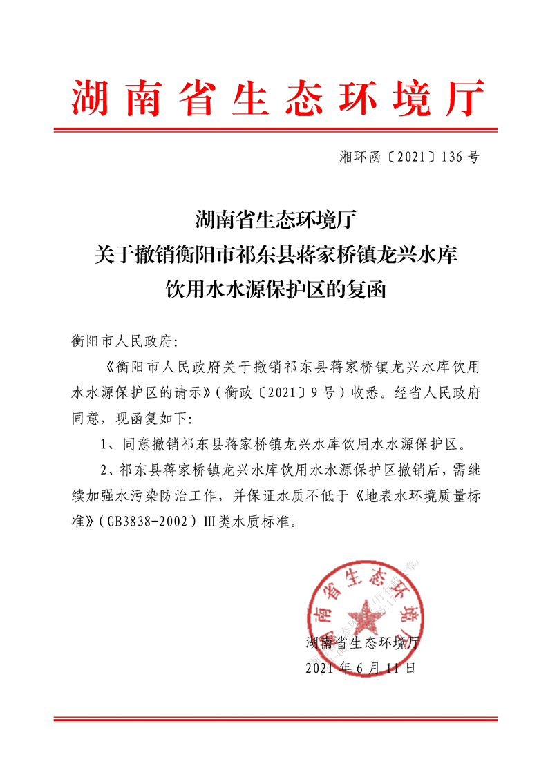 關(guān)于撤銷衡陽市祁東縣蔣家橋鎮(zhèn)龍興水庫飲用水水源保護區(qū)的復(fù)函