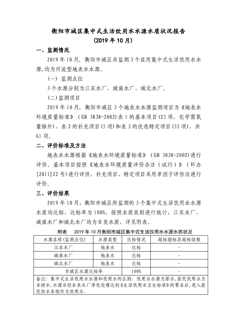 衡陽市城區(qū)集中式生活飲用水水源水質(zhì)狀況報告(2019年10月)