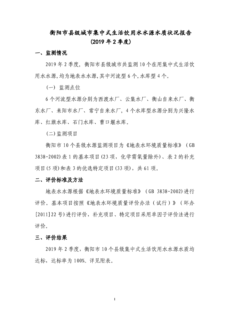 衡陽市縣級城市集中式生活飲用水水源水質(zhì)狀況報告(2019年2季度)